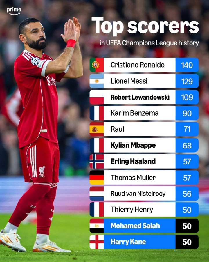 博亚体育(中国) 欧冠历史弓手榜: C罗140球居首, 梅西第2, 凯恩 萨拉赫50球进前十