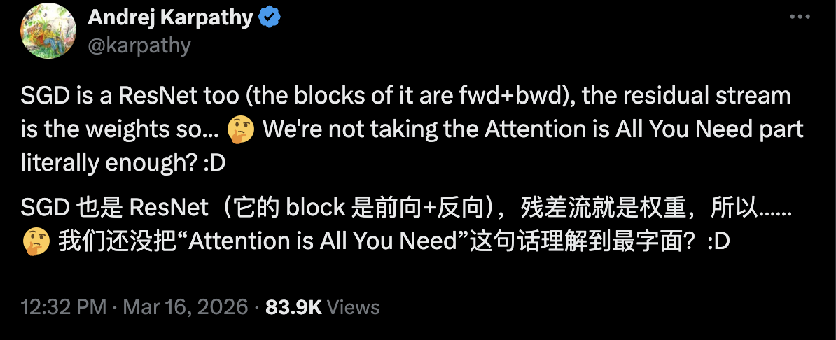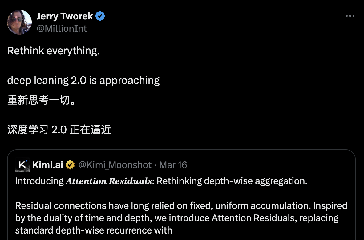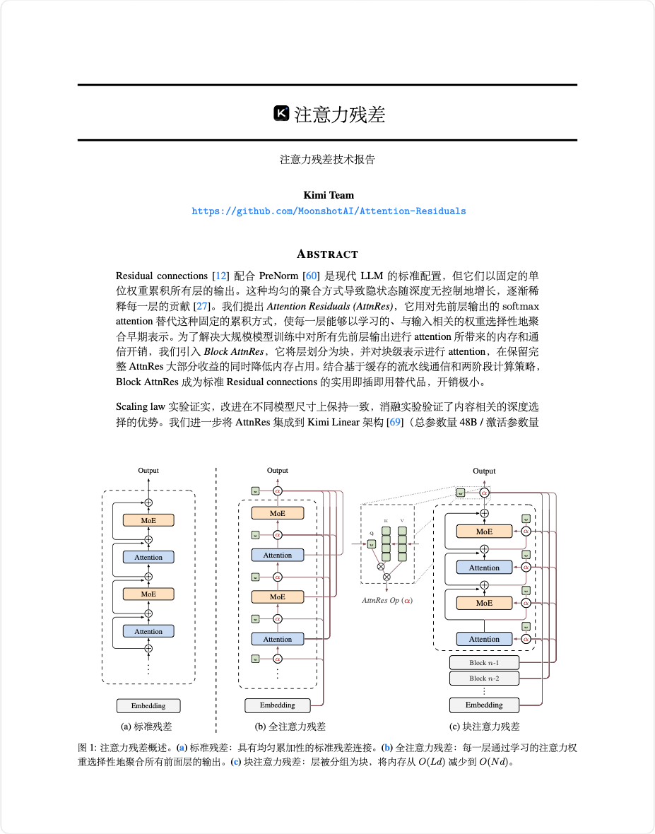 【环球网科技详细报说念】3月16日,月之暗面Kimi发布了一项重磅本领推崇《Attention Residuals》(注眼光残差),淘气大模子架构中的瓶颈,再行策画深度学习中中枢的残差聚会结构。该本领不仅被业界解读为下一代模子架构的预示,也得到硅谷顶级AI人人和企业家的庸俗海涵。马斯克评价这一参谋“令东说念主印象深化”。