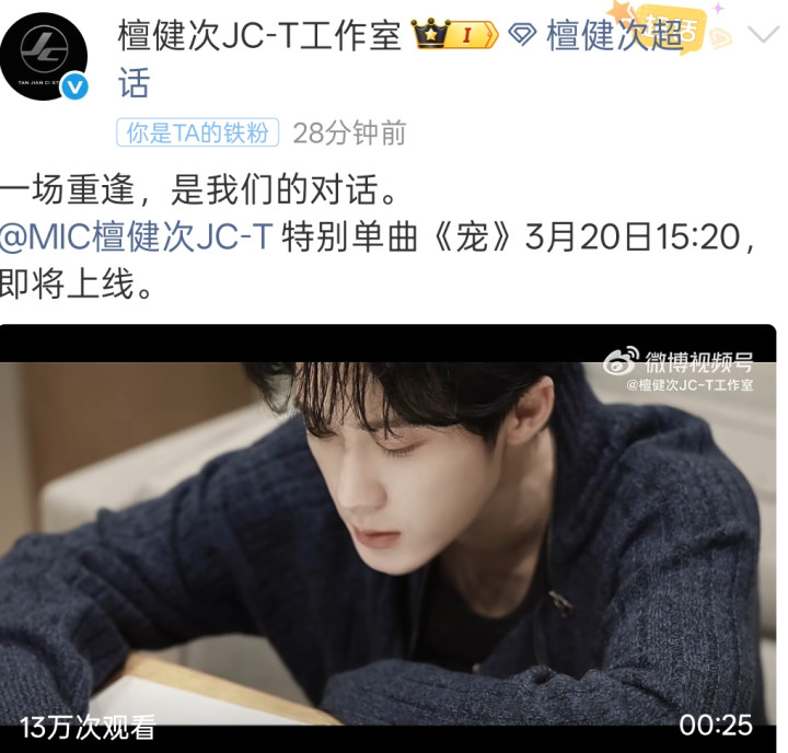 檀健次为小炭火格外制作的单曲《宠》3月20号下昼3点20上线,檀健次都备纵欲疯子来的,在粉丝寿辰这天,也不错称之为成亲牵挂日这天,送给咱们一首“格外单曲”,名字叫作念《宠》!