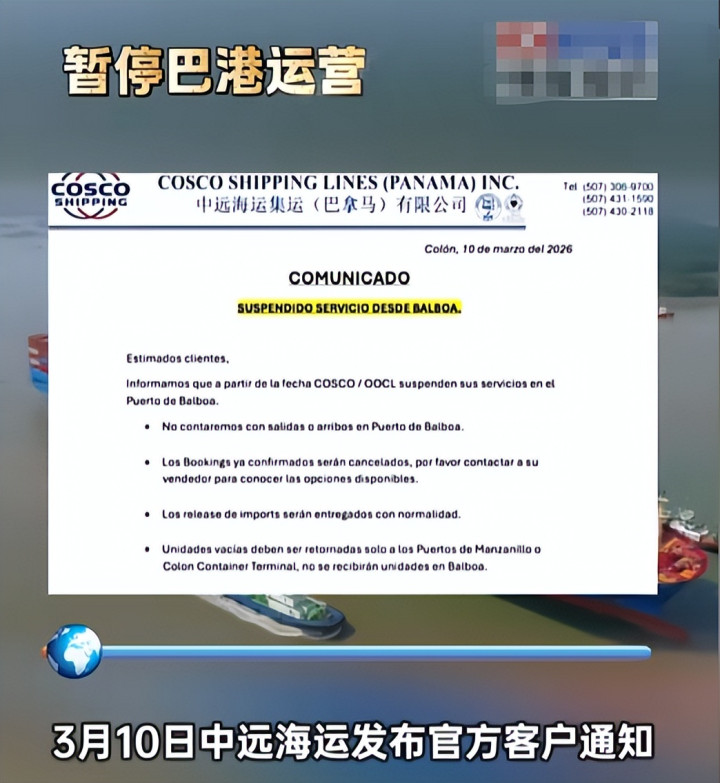 3月10日全球航运巨头中远海运及旗下东方国际发布官方奉告,暂停在巴尔博亚港通盘到离港办事,已说明订舱一起取消,空箱需转运至其他指定船埠。