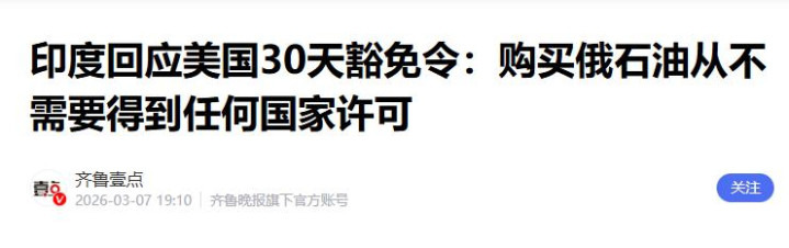 3,印度回话好意思国30天豁免令:购买俄石油从不需要得到任何国度许可 2026-03-07 19:10 皆鲁壹点
