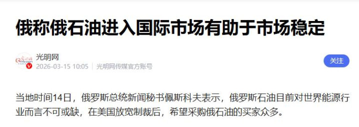 5,俄称俄石油插足海外市集有助于市集平稳 2026-03-15 10:05 光明网