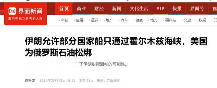 1,伊朗允许部分国度船只通过霍尔木兹海峡,好意思国为俄罗斯石油松捆 2026年03月13日 09:35 界面新闻