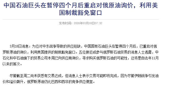 4,中国石油巨头在暂停四个月后重启对俄原油询价,专揽好意思国制裁豁免窗口 2026年03月18日07:32 上海澎博财经资讯