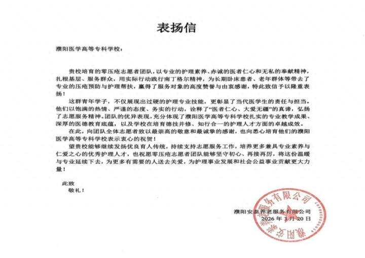 3月20日,濮阳医学高级专科学校守护学院“零压疮志愿团”前去濮阳市示范区卫齐概述养老院,开展健康科普、兴趣互动与暖心陪同志愿行状,志愿者们凭借塌实的专科手段与忠实的暖心陪同,取得老东谈主们的一致好评,养老院特颁发表扬信致谢。