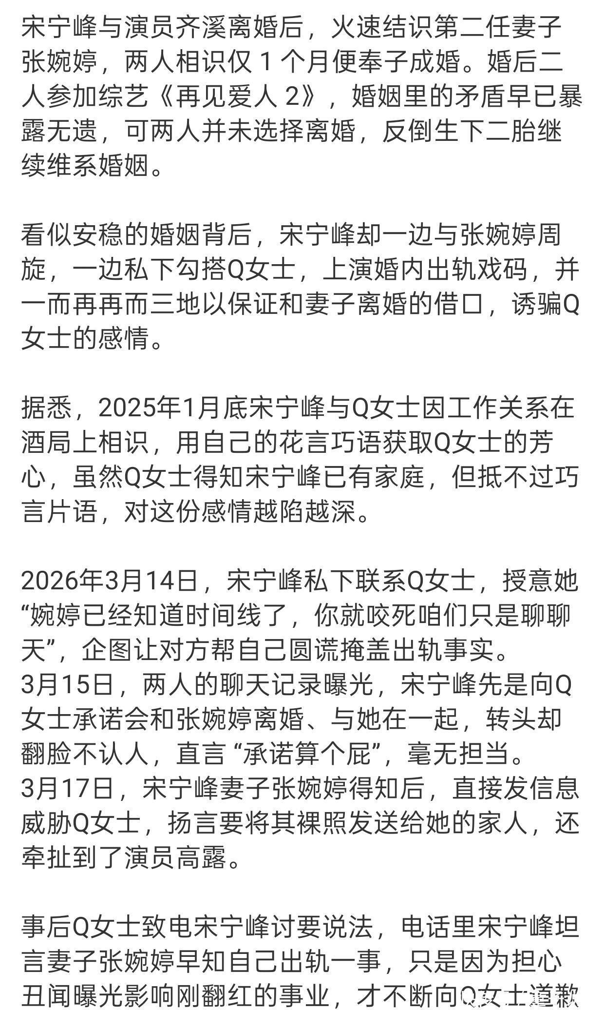 爆料的Q女士手里执简直锤,聊天记载和灌音全是她主动提供的。她说两东谈主早在2025年1月的责任酒局上就联结上了,那时宋宁峰明明有家室,却如故主动示爱,搞得她明知是火坑也跳了。这一年多里,两东谈主不仅互发巧妙照,宋宁峰还信誓旦旦应许要仳离娶她。恶果呢?东窗事发后,他立马变脸,博亚体育app官方入口反咬一口说Q女士是“外围”,以致耍恶棍要对方抵偿蚀本,这操作几乎刷新下限。