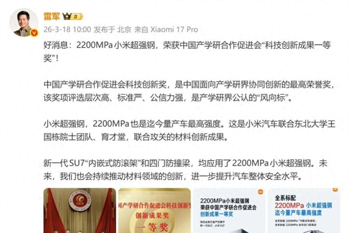 雷军公布小米研发的2200MPA超强钢荣获中国产学研谄媚促进会颁发的科技翻新一等奖。