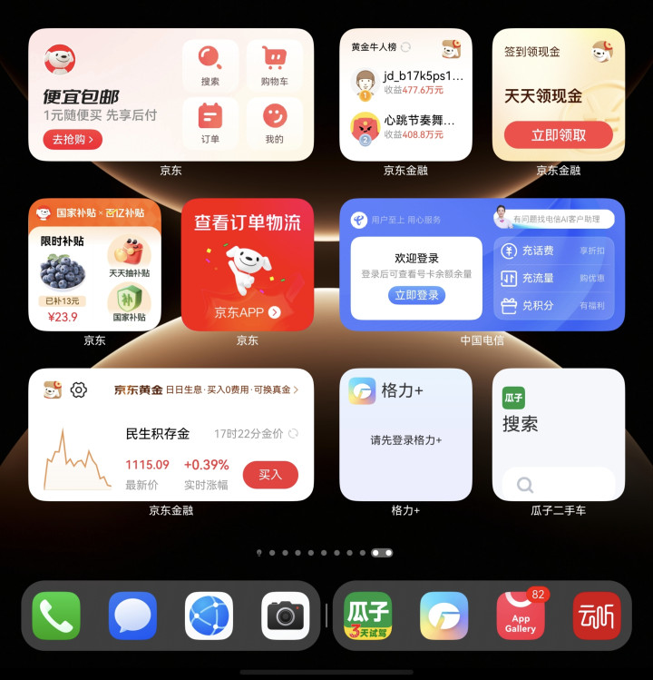 京东卡片:商城、百亿补贴、物流景况都摆上桌面。念念查件看一眼,念念省钱点一下。