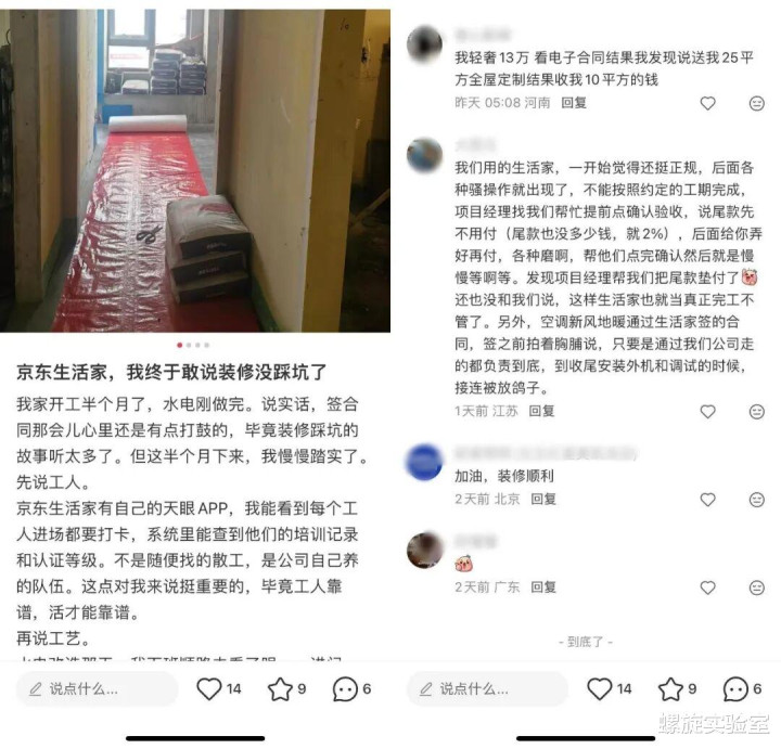 其次,要斥地口碑和信任,依然任重谈远。在小红书上,有效户大赞京东家装不踩雷,但也有效户装修吐槽装修质料、施工东谈主员不负责等。京东要作念好“尺度化”,扭转家装行业多年以来的恶疾,只怕非一日之功。