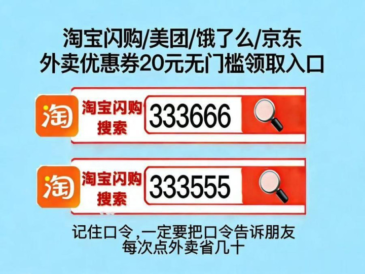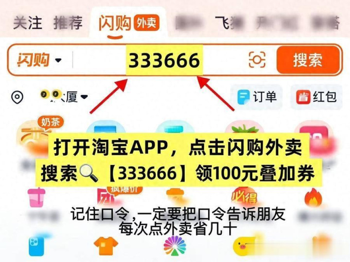 淘宝闪购搜【333666】【333555】是淘宝闪购外卖券领取进口,淘宝闪购外卖优惠券红包口令淘宝闪购搜【333555】,闪购优惠券淘宝闪购重复券怎么领取?闪购外卖重复券大额券告成去淘宝闪购搜【333666】领外卖神券包。