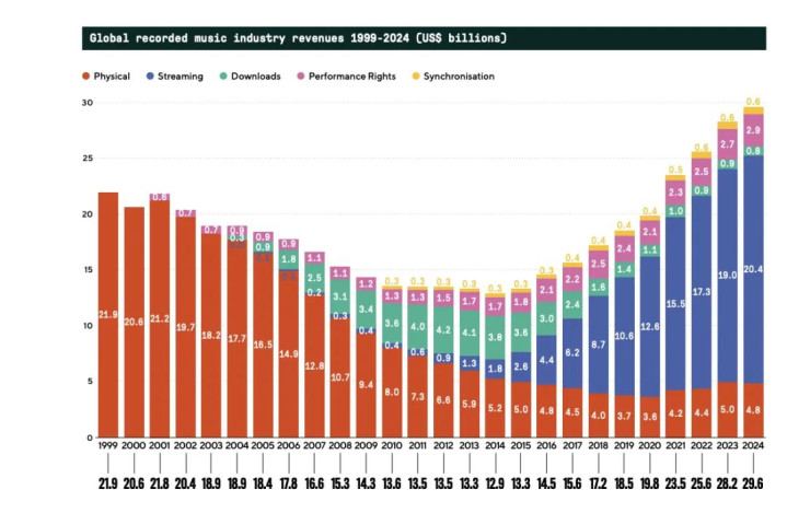腾讯音乐濒临的窘境,是扫数这个词行业的缩影。凭证海外唱片业协会(IFPI)最新发布的《2025人人音乐证据》,尽管2024年人人流媒体总收入初次突破200亿好意思元,达到了204亿好意思元,占人人录制音乐总收入的69%,但其7.3%的增长率依然真切疲态。在北好意思、欧洲等熟练市集,用户增长几近停滞。