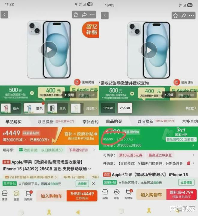 从报说念来看,天津浪费者于先生思买一台iPhone15,2月6日天津“国补”上线前,得手价照旧4449元;等补贴500元的策略讲求顺利后,价钱反而跳到了4799元。