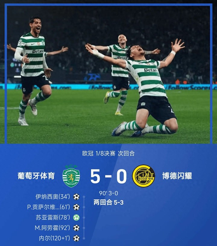 3月18日25/26赛季欧冠1/8决赛次回合,葡萄牙体育与博德精时老例期间战至3-0,两边两回合总比分战平干预加时赛,葡萄牙体育历程120分钟血战,以5-0驯服博德精通,总比分5-3(首回合0-3)淘汰敌手。全场比赛,苏亚雷斯传射立功,贡萨尔维斯、伊纳西奥破门,特林康两献助攻,阿劳霍加时闪击,内尔加时补时进球锁定胜局,博德精通门将哈伊金全场孝顺9次扑救难救主。