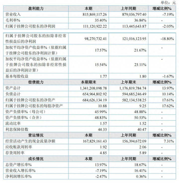 2025年,恒兴股份杀青营业总收入8.16亿元,较2024年的8.79亿元同比着落7.19%;杀青包摄于母公司扫数者的净利润1.11亿元,较2024年的1.13亿元同比微降2.05%;扣除非平生性损益后的归母净利润为0.98亿元,盈利端降幅远低于营收端,展现出极强的标的韧性。