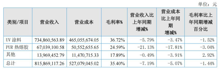 当作第一大收入开始,恒兴股份的UV涂料业务展现出了极强的基本盘安逸性。2025年,公司UV涂料杀青营收7.35亿元,占总营收比重90.07%,较2024年的7.80亿元同比着落5.79%,降幅显赫低于总营收降幅;产品毛利率为36.71%,较2024年的38.24%小幅回落1.53个百分点,仍处于涂料行业较高盈利水平。