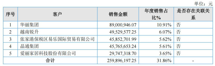 2025年,恒兴股份前五大客户销售占比达31.86%,客户结构安逸且各客户之间无有关联系,其中,丽都集团销售金额8.90亿元,占比10.91%;越南锐升销售金额4.95亿元,占比6.07%;张家港保税区易乐国际贸易有限公司销售金额4.59亿元,占比5.62%;晶通集团销售金额4.58亿元,占比5.61%;爱丽家居科技股份有限公司销售金额2.97亿元,占比3.65%。