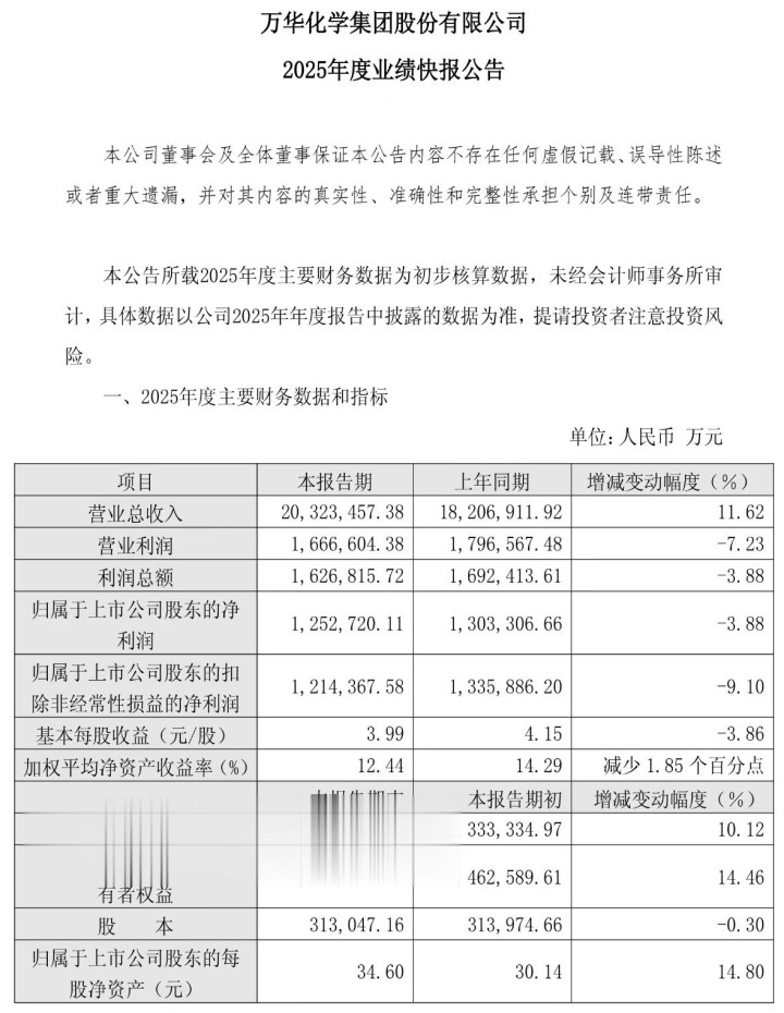 3月16日晚间,万华化学(600309.SH)发布2025年度功绩快报,递上一份休戚各半的收货单,营收首破2000亿元大关,净利润却仍不断下滑趋势。