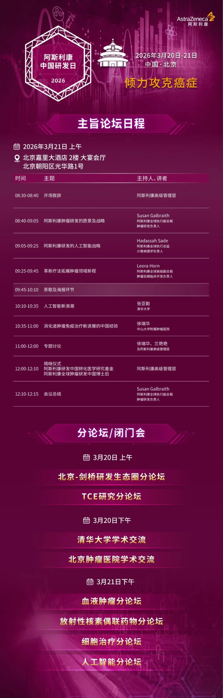 3月20日至21日,阿斯利康中国研发日肿瘤专场将再次在北京开启。在阿斯利康大家扩充副总裁、肿瘤研发雅致东说念主SusanGalbraith的携带下,药物早期发现、靶点发现、生物工程、临床开辟、细胞援手、血液肿瘤、东说念主工智能等鸿沟大家研发干系雅致东说念主近四十东说念主全程参与。举止由一个主旨论坛和八个分论坛构成,瞻望将有来自临床有计划机构、高档院校和生物科技公司的近两百位大家与代表到场疏导,限度创近五年新高。