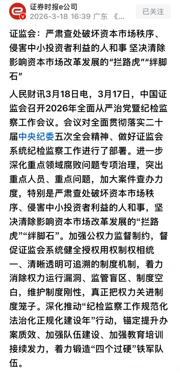 东说念主民财讯报说念,证监会在2026年全面从严治党暨纪检监察职责会议中相等强调,严肃查处浮松成本市集纪律、侵害中小投资者利益的东说念主和事,刚烈撤消影响成本市集调动发展的“拦路虎”和“绊脚石”。