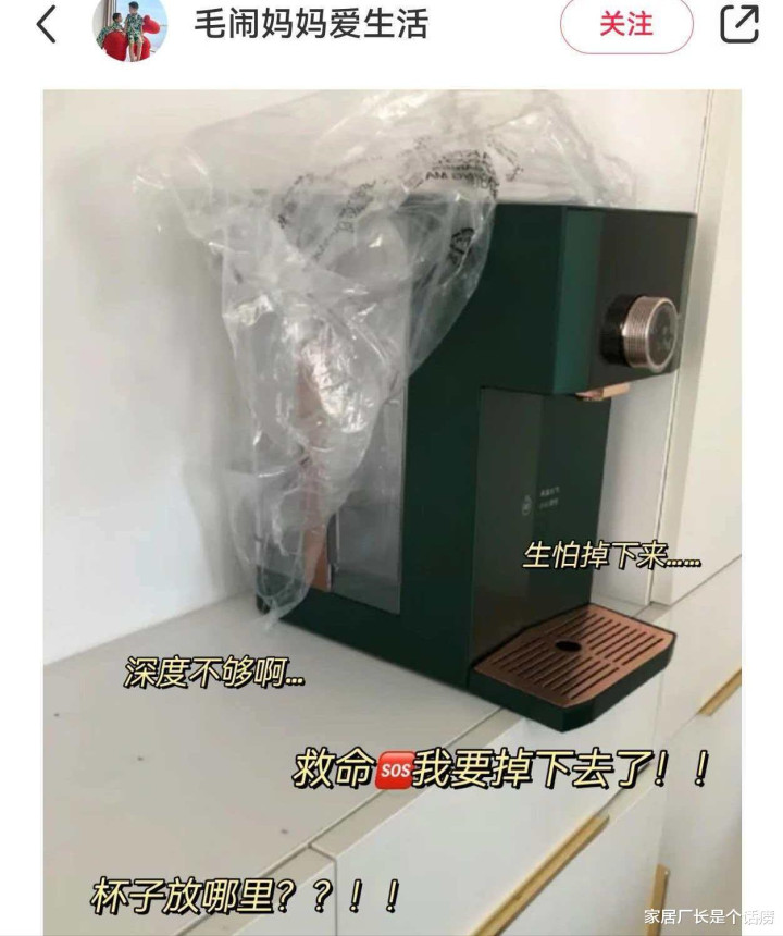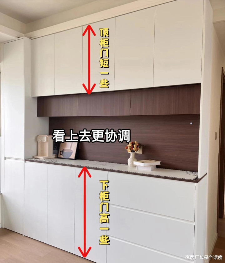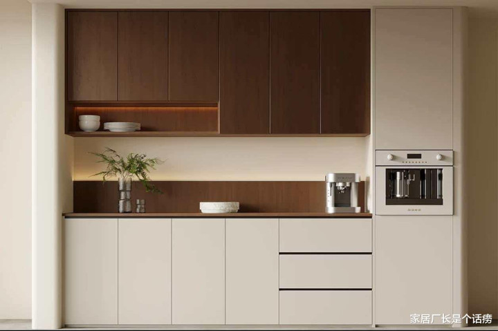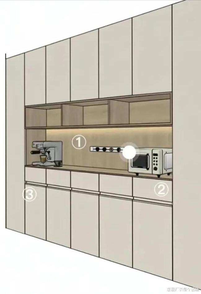 深度一定要提前算好,把想放的烧水壶、电饭煲、咖啡机这些小家电的尺寸都量一遍,深度不够的话,小家电会超过柜体,使用受影响,将就症看了直呼落索,视觉上膈应。