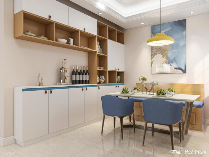 小户型作念餐边柜,中枢是「摧折」,减少过剩的花式分割,让柜子举座看上去干净清亮,弱化视觉上的肥美感,才不会让小餐厅显得更挤。普通够用。