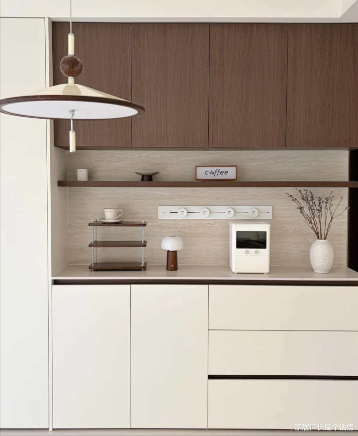 淌若家里的收纳空间实足,餐边柜没那么多东西要放,想让餐厅的空间显得更松弛、汜博,实足可以罢休或减少吊柜,只作念地柜 + 操作台,上方加多层板,幸免空荡。
