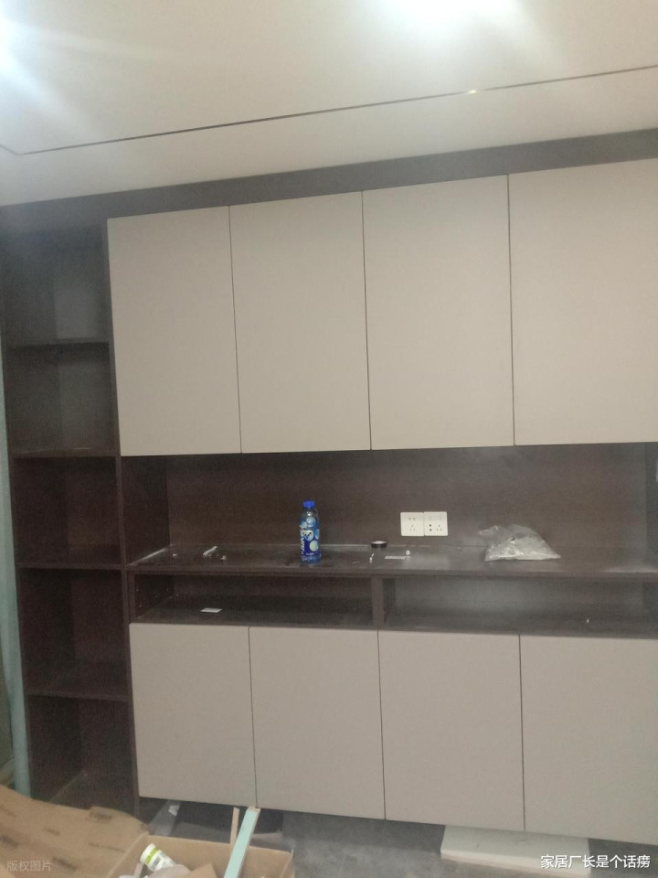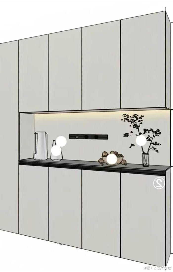 凹凸封板尽量作念极窄的,或者径直作念遮蔽式,两侧不需要硬上无收口,那对墙体要求很高,用18 mm板就够了,千万别用5-8公分的宽收口(商家图容易),会让餐边柜的精采感蓦的隐匿,改都没法改。