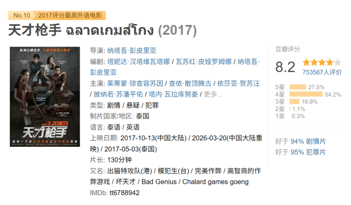 口碑层面,《天才枪手》杀青了环球范围内的全面封神。豆瓣评分适当在8.2分足下,是往日评分最高的外语片之一;北好意思烂番茄崭新度达100%,爆米花指数高达95%,IMDb评分也适当在8.3分,成绩环球影评东说念主一致好评。