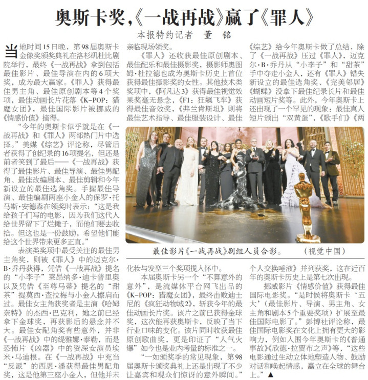 当地时代15日晚,第98届奥斯卡金像奖受奖庆典在洛杉矶杜比剧院举行,最终《一战再战》拿到包括最好影片、最好导演在内的6项大奖,成为最大赢家。《罪东谈主》得到最好男主角、最好原创脚本等4个奖项,最好动画长片花落《K-POP:猎魔女团》,最好海外影片被挪威的《厚谊价值》摘得。
