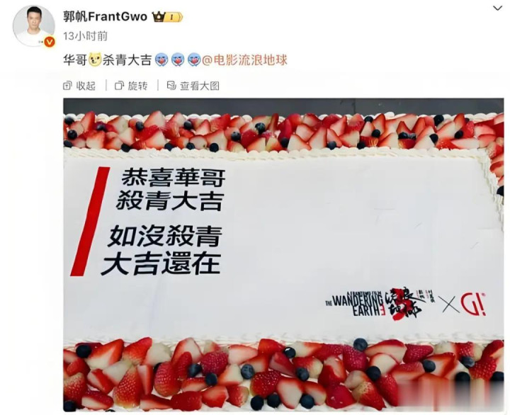 1月9日,导演郭帆晒出一张蛋糕像片,上头写着“恭喜华哥,兑现大吉,如没兑现,大吉还在”。