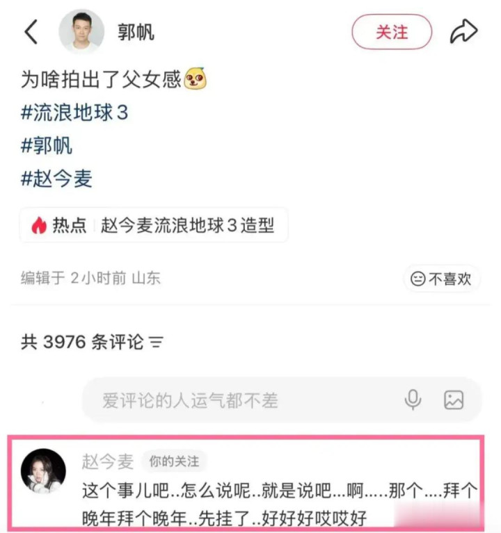 赵今麦本东谈主看到热搜后,在驳倒区回复郭帆:“这个事儿吧..怎样说呢..即是说吧......啊......阿谁....拜个晚年拜个晚年..先挂了..好好好哎哎好”,两东谈主互动,道理完全。