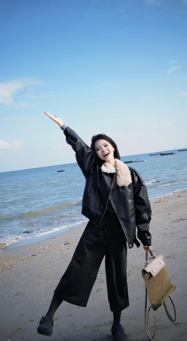 All black的穿搭,看似从简,本色上相称高等有品位。玄色的皮夹克,藏肉又帅气,搭配玄色八分阔腿裤,好意思妙遮住胯宽、臀肥、腿粗的现象。