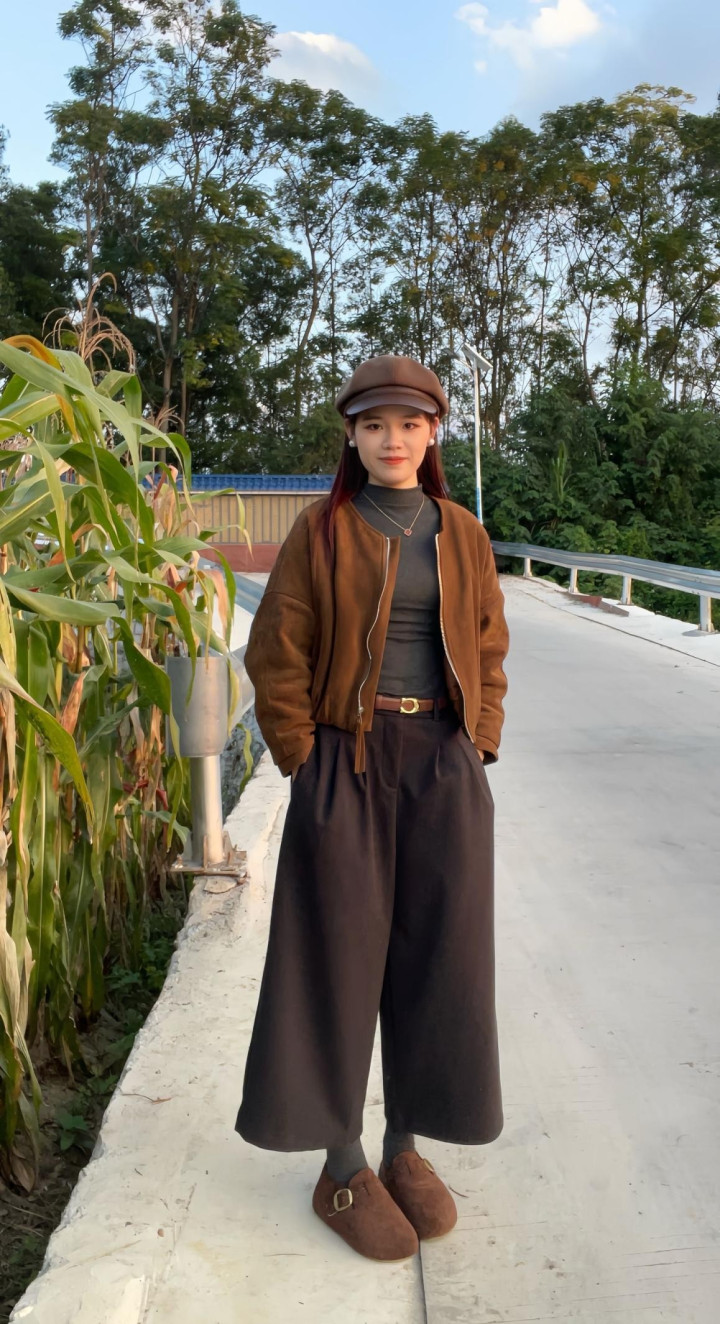 自带复旧感的麂皮夹克衫,穿在身上秒变“霸气女王”。搭配高腰线形式的八分裤,一键收住腰线,裤腿位置的合手褶预备,又能很好意思妙的藏起赘肉,扎根腰带,蓦的优化比例。另外八分裤的深色系搭配让造型更具作风品性,升华了贵气和高等感。