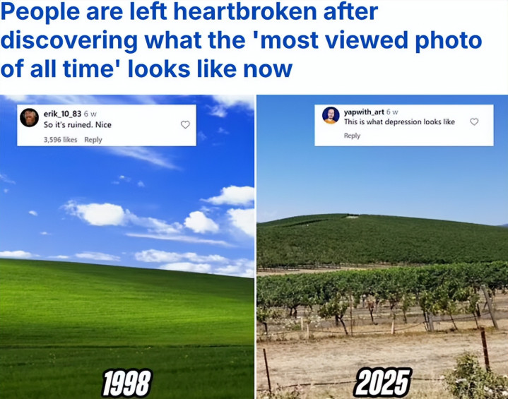 当东说念主们找到“大众不雅看次数最多的相片”的拍摄地时,皆心碎了。左边是经典的Windows XP默许桌面“极乐”,右边是湮灭地方如今的样式——已被一派葡萄园粉饰。