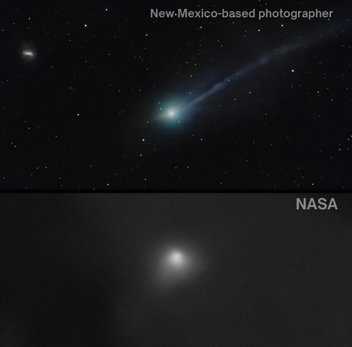 左边是业余天文体家拍摄的星际天体3i/Atlas,右边是耗资近250亿好意思元的航天机构拍摄的湮灭指标。视角不同,了了度迥乎不同。