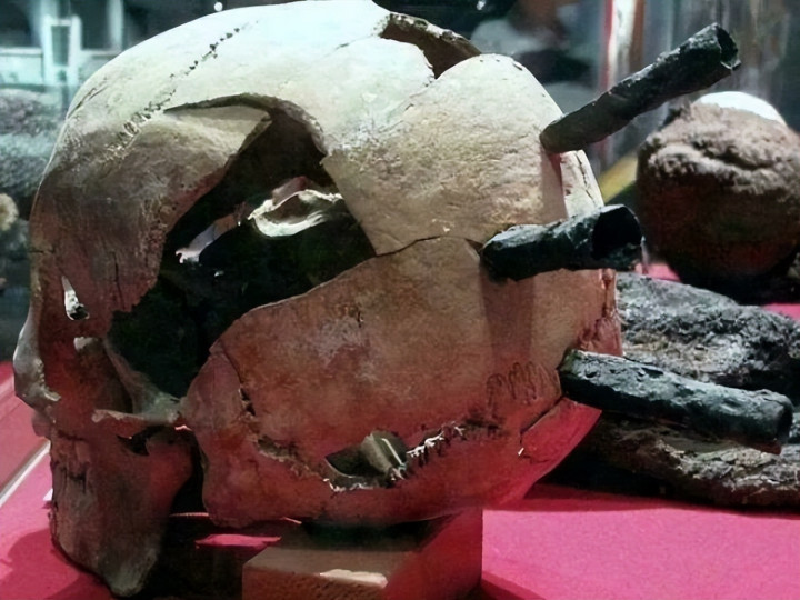 这个头骨上,6686还嵌着1361年瑞典维斯比讲和时射入的箭头。那是冷武器期间最直不雅、最狰狞的图章。