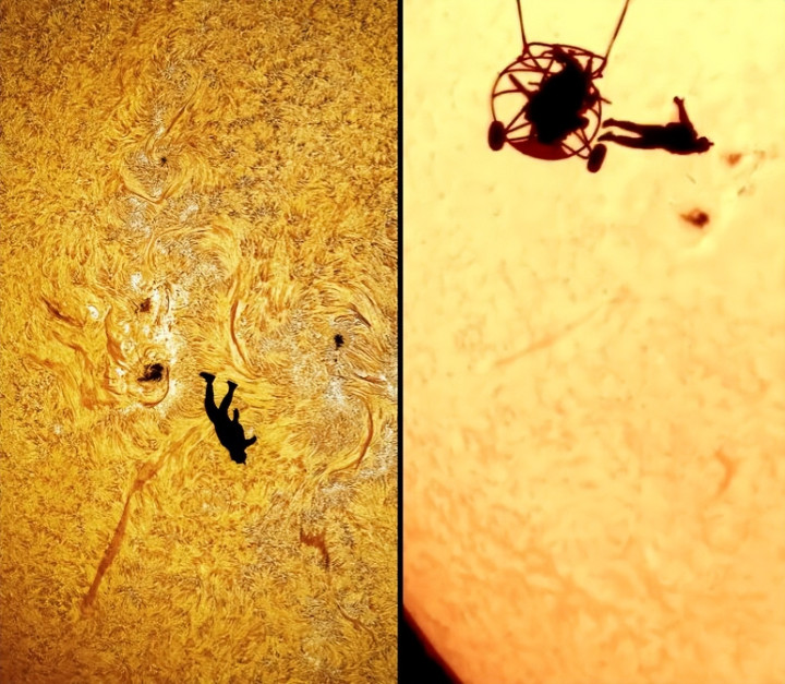 这是一张委果相片。一个委果的东说念主影,正好嵌在太阳圆盘的正中央。这是安德鲁·麦卡锡在他一又友跳伞时捕捉到的蓦然。